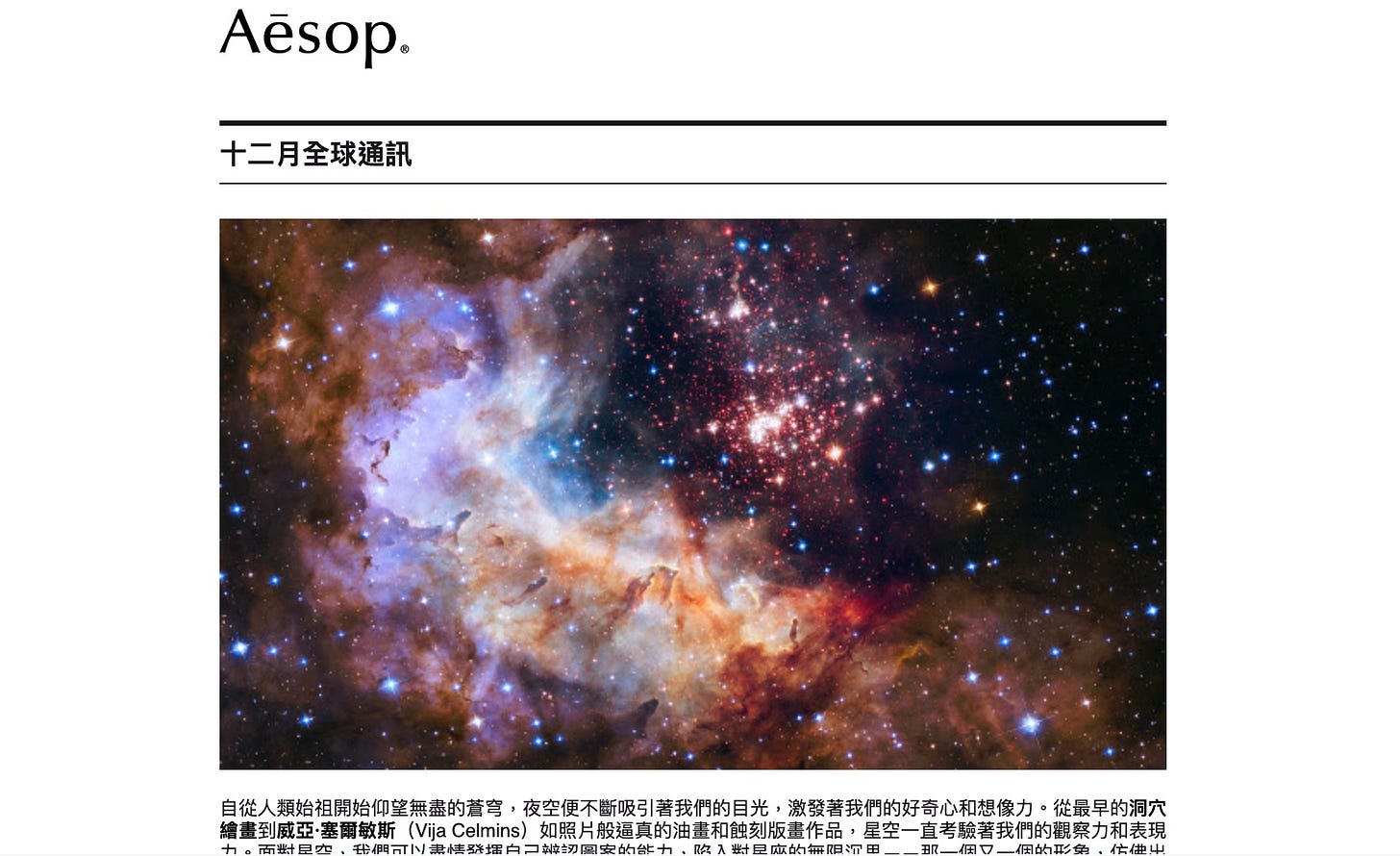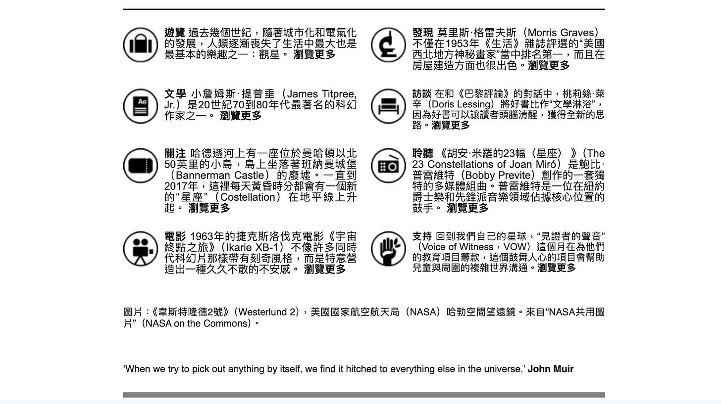 對夏日海平線、neo-luxurious等季度概念描摹起若有似無如詩般的短句,嘗試不同下標進行A/B test2,但我當時最喜歡的電子報卻是Aesop每月《全球通訊》通訊的文集3。裡面會集結文學、電影、住宿、聆聽、旅遊、人物、訪談等主題文章,擷取一些片段資訊比如: