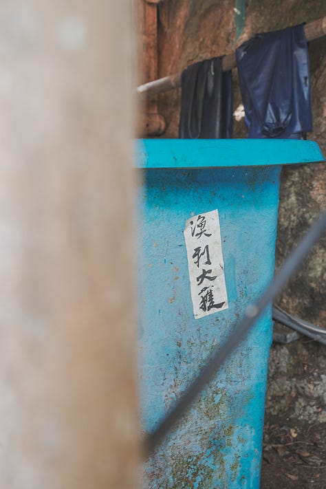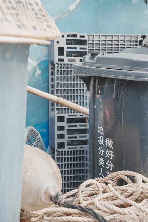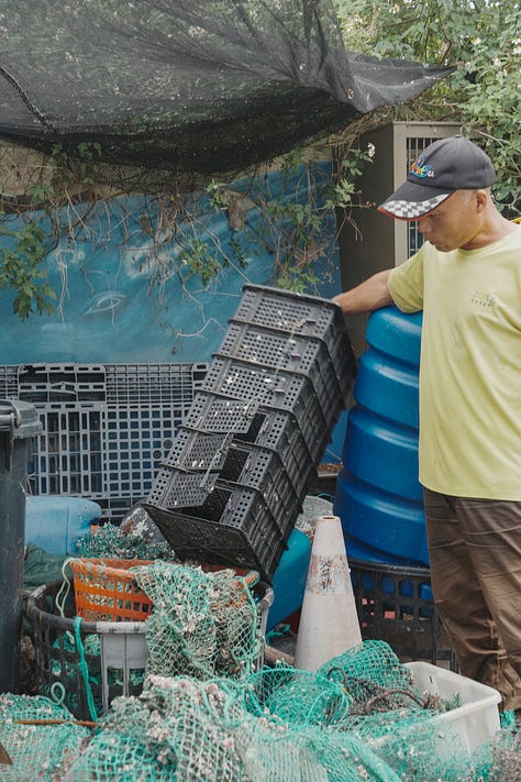 大哥正在整理剛採收上岸的淡菜,刀子剁剁剁地清理著附著淡菜殼上的藤壺,檯面、地上葵瓜子般小小的豆蟹爬來爬去。我們問大哥網子和蟹籠得去哪買,他說海裡撿的啊,從中國漂過來,撿不完。看到在一旁堆置,以簡體字寫著「垃圾分类」的大型黑色垃圾桶,笑說那該不會也是海上撿來的吧?