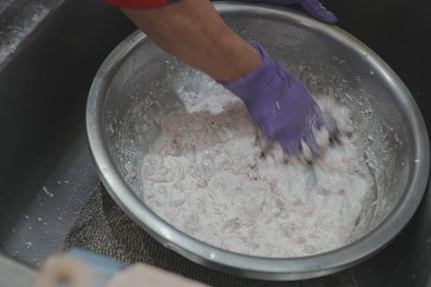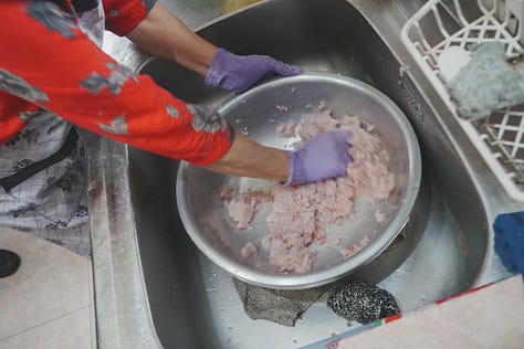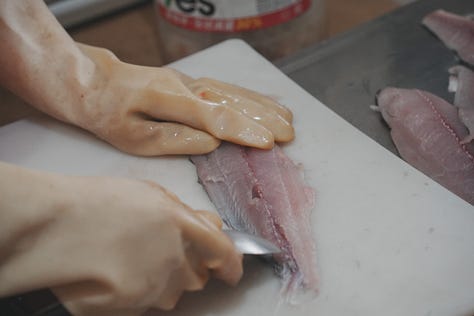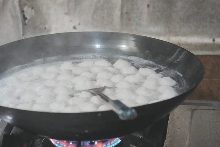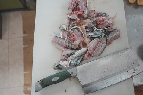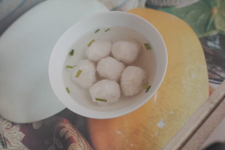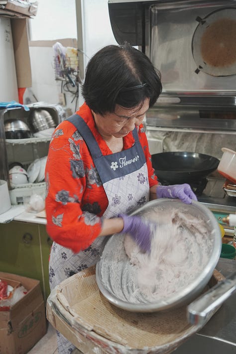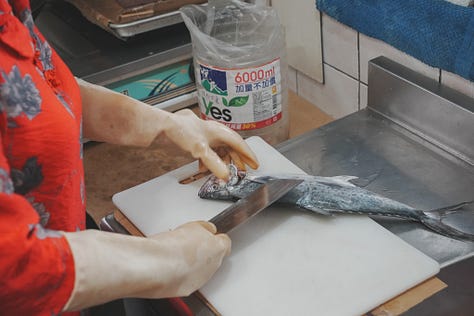 傍晚,到馬港找阿姨學打魚丸。美君事先就買了兩條馬加魚去給阿姨,待我們抵達,便從冰箱裡拿出魚,去頭尾、剖片,用一隻湯匙順著筋肉刮出細緻的肉泥。喃喃地念著魚肉、水和太白粉的比例,批次加入,以手慢速拌勻,再快速攪打,發出「啪,啪,啪」的聲音,說是要將空氣打進去,魚丸口感才會軟Q蓬鬆。忘了筆記配方,倒是想起六月去濟州玩,從小里小文帶回一本記述濟州海女的精裝書,名字就叫《입말음식》(Spoken Recipe/口傳食譜)2。