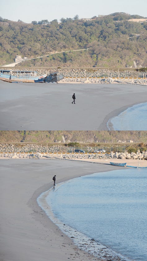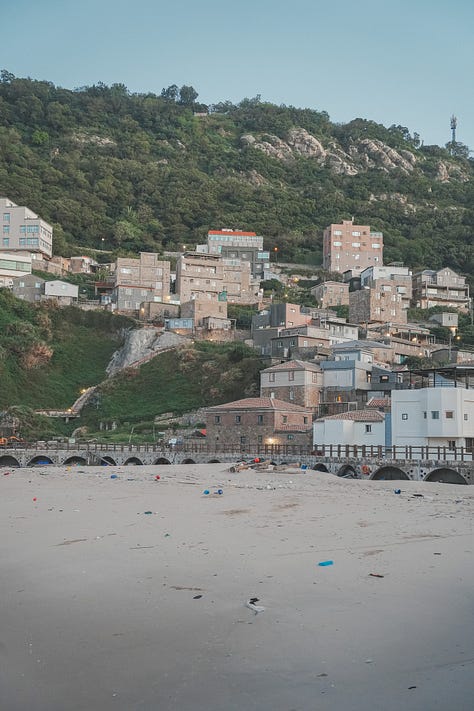 幾個地方小孩成群赤腳在沙灘上玩,我待到日頭全落,有點失望地看著山頭蓋住西邊,想是無法看見彗星了。馬祖無數垂直村落,房舍如藤蔓攀附壁面生長,天暗同時路燈也沿坡地噠噠噠逐一瞬間亮起。從塑膠袋裡又掏出一顆繼光餅,邊啃著走回山隴(介壽),開始很冷,決定還是去大三元拎一袋炸物到廟前廣場當晚餐。