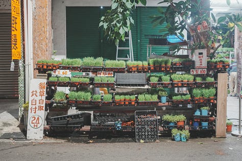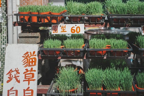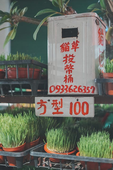 離開步道,走南台街要去搭車,途經一家24小時自助貓草店。才從夢裡走出來又走進夢裡,好像被胖貓帶去了地球屋,離開後被索討獎勵那樣地帶去貓草店。打理貓草店的是個看起來平凡不過的地方阿伯,我要了一盆80元的,他替我裝袋,問我有養貓吼?