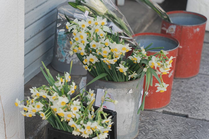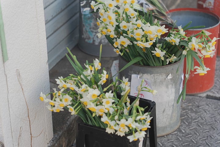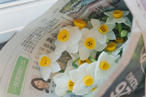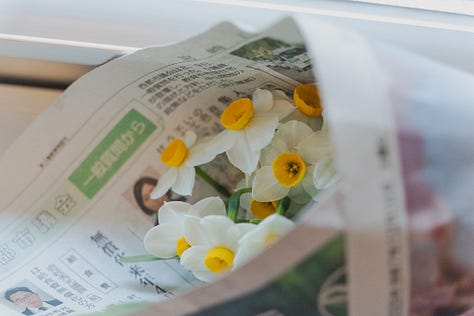 水仙切花在台灣不太常見,前幾週到宮崎出差,在前往當天最後一個採訪點時,途經一個婦人在街邊擺攤賣蔬果,還有幾桶水仙切花。那時候想,採訪結束後再去買。不太好意思麻煩別人的脾性,但卻在踏出採訪點夥伴們往反方向走時,趕緊小跑步說他們先走,我去買花,很快跟上。我湊近,才仔細看價錢,一小把才100円,台幣不過20元。我挑了兩把,婦人用塑膠袋和報紙替我包起來,夥伴則替我翻譯她交待的照料資訊。即便我也剩下三天會待在宮崎,並且根本沒花瓶什麼的。