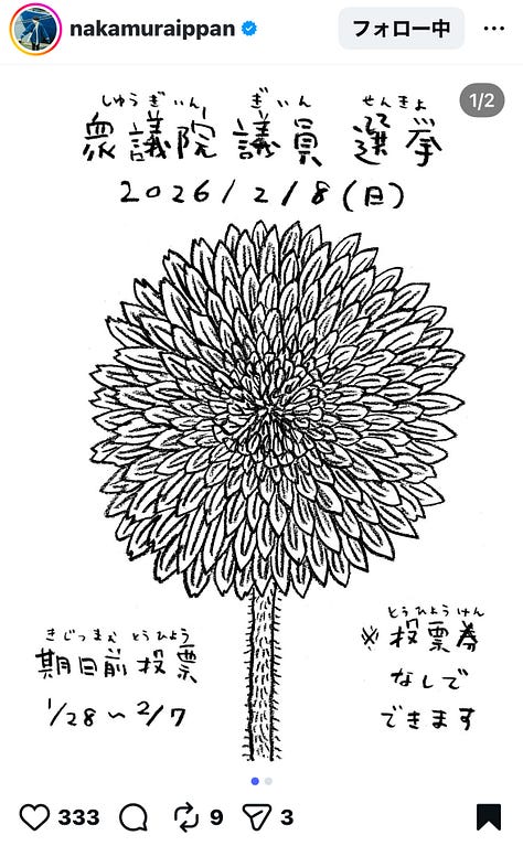 對於日本政治太過陌生,以為他們一直都偏向冷感,也很不解為何日本社會對「轉型正義」毫無興趣。(相對德國、韓國和台灣,不過這是另外一題,也很有趣)但這次為了與高市早苗與其所屬的自民黨相抗衡,而有這麼多插畫家以如此優しさ的方式響應,好感動。不過據說投票當日許多地方會降大雪,雖有段時間可提前投票,但也讓不少人生氣:「那些不良於行者的投票權益誰來照顧?」