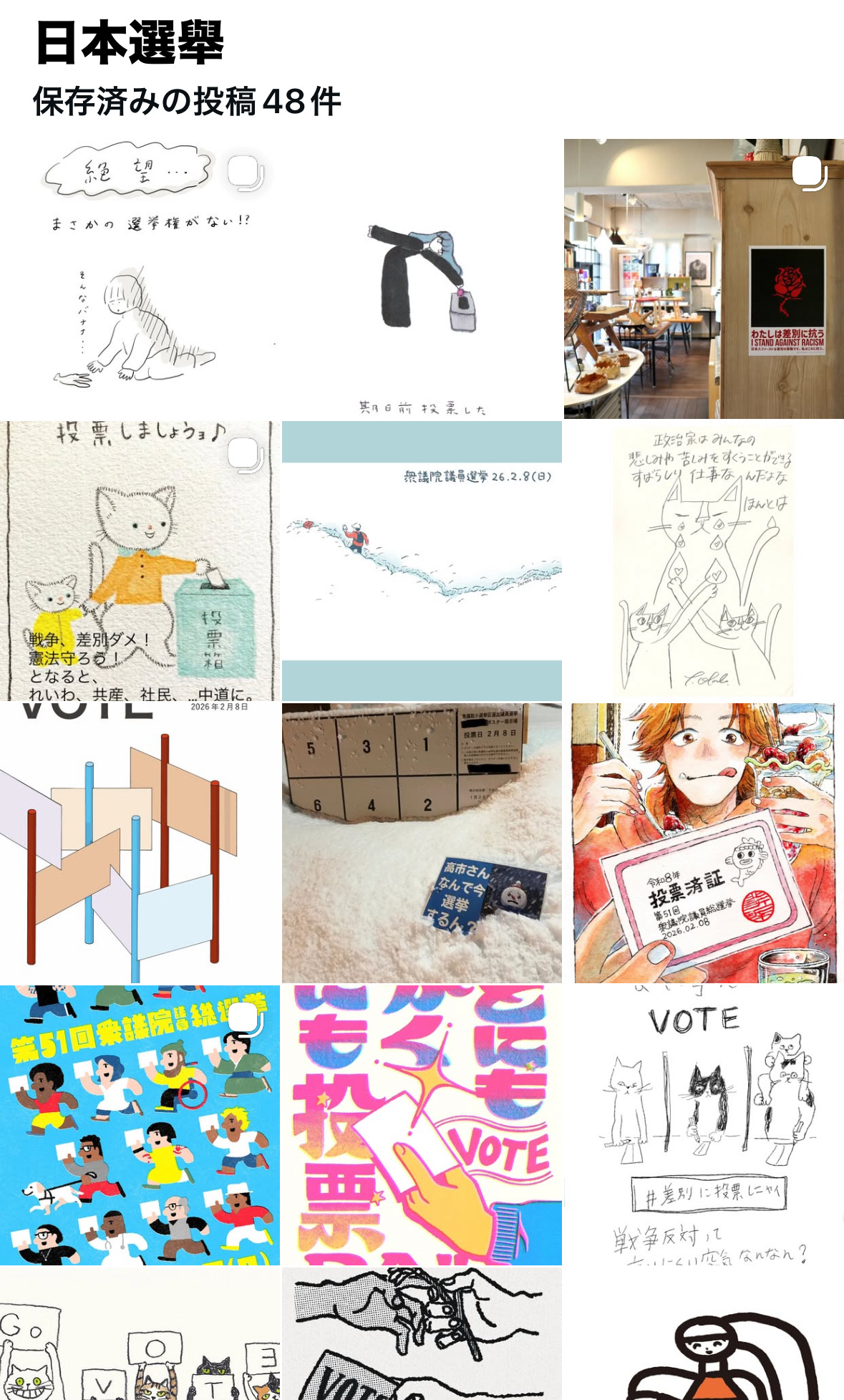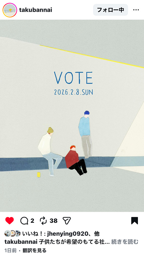明天(2/8)是日本眾議院選舉,這次和往常不同的地方是,我不斷在IG上滑到日本插畫家們為選舉催票畫的海報。由於高市早苗在台灣真的太受歡迎了,我本也直覺以為他們也都是支持自民黨,但愈看愈不對勁,截圖問Gemini,意外它結論是:「這些插畫家應是希望提高投票率,以制衡高市早苗所屬的自民黨。」太衝擊了!馬上丟訊息問z,z又再丟訊息問她日本朋友,我們才研究出,原來日本藝文圈的同溫層和台灣一樣偏左派,根本不可能支持偏右、極保守派的高市。這群人的共同信念包含(但不限於)反戰、支持同婚、反夫妻必要同姓、反統一教醜聞等等。